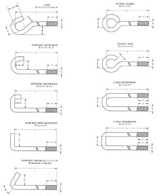To avoid possible misunderstanding when specifying the dimensions of bent bolts, it is recommended that they be given in the order indicated by the dimension letters in brackets above each illustration. For example, if a J-Bolt is required with D = 3/8", L = 6", C = 1", E = 5/8", thread length T = 1-1/2", M = 7/8", and N = 1-1/4", it should be specified as a 3/8" x 6" x 1" x 5/8" x 1-1/2" x 7/8" x 1-1/4" J-Bolt.